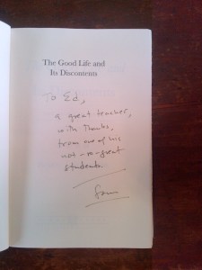 Below are shots of a copy of Samuelson’s impishly titled The Good Life and Its Discontents: The American Dream in the Age of Entitlement, 1945-1995 (Times Books, 1997) that he gave to Banfield. The inscription reads, “To Ed, a great teacher, with thanks, from one of his not-so-great students. Sam”