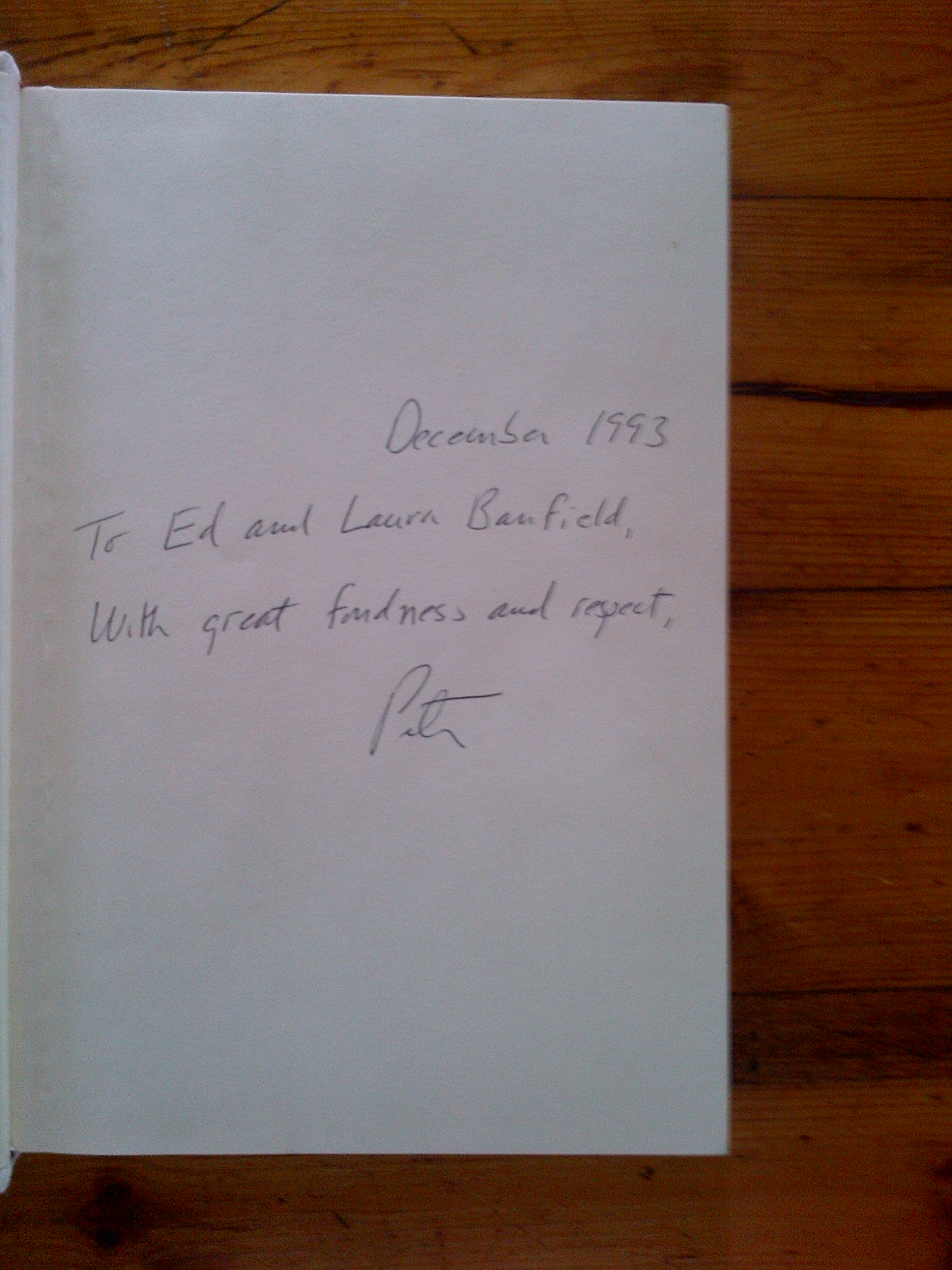 Two photographs of a copy of a Skerry-inscribed copy of Mexican Americans are below. The inscription reads, “December 1993 To Ed and Laura Banfield, with great fondness and respect, Peter.”