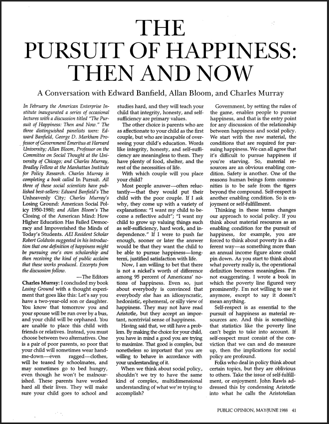 Thus begins Edward C. Banfield’s contribution to this 1988 symposium convened by the American Enterprise Institute (EI). What a gathering: Banfield, Allan Bloom, and Charles Murray, three social scientists who had written best-selling books. They were convened by longtime AEI fellow, Robert Goldwyn, who authored and edited a number of books.