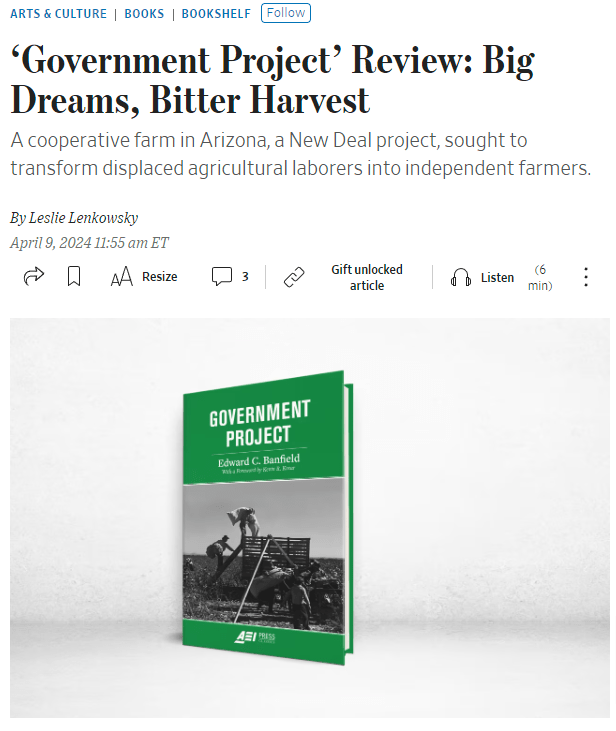 AEI Press republished Edward C. Banfield’s classic book, Government Project, in late December 2023. Copies of the book may be purchased at https://amzn.to/48S4nV2. The new edition retains Banfield’s original text, Rexford Tugwell’s original introduction, and a new preface by Kevin R. Kosar. Government Project tells the story of an attempt by the US government to remake the lives of some of its citizens by establishing a cooperative farm in Pinal County, Arizona, in 1937. These individuals were among the most desperately poor and disadvantaged in the nation. The farm financially succeeded for a time, but the inhabitants shuttered it in its seventh year of operation. Many of them walked away with hardly anything, to the shock and dismay of the government officials overseeing it. Government Project deftly explains what went wrong at Casa Grande. In telling this story, Banfield illuminates larger truths about human nature and the limits of governance.